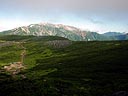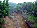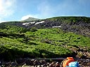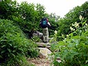 | 10分間のどっこいしょ登り。相棒、ついにゲェゲェ始める。本人は、2週間前の至仏の時のように胃の内容物を吐き出したいようだが、吐けずに苦しんでいる。しばし休憩。どっこいしょ登りの後、1時間はかかると覚悟していたが、意外と早く御中道からの下り道を合流。後は、双六小屋に向けて急降下。 |