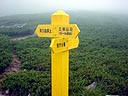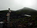 | 歩き出したが、ガスが濃くなり昨年のように急に降り出されてもいやなので少し早いが雨具を着る。山荘から三俣蓮華まで(巻道との分岐)は、登るにつれガスが濃くなり何も見えない状態になる。さっき食べたカレーが、二人とも胃にもたれてつらい登りとなった。頂上への分岐に来たが稜線はガスっていて確認できず、迷うことなく巻道をゆく。この巻道は、三回目。途中の"どっこいしょ登り"(丸山のカール壁登り?)までが長く感じていたが、難なく到着。 | ||