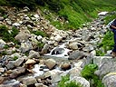 | 第一雪田には大量の雪渓。雪渓の中を歩く。雪ではなく硬い氷だ!第二雪田の大量の雪解け水が滴り落ちる脇を通過すると、道は源流に向けて急降下していた。(心境:誰か、三俣山荘まで橋を架けてください。)下降の途中、何組かに抜かれる。抜かれた中で、その後、何度か出会ったのが、源流のカップル(勝手に命名)であった。 岩がゴロゴロする急坂を下りきると黒部川源流部の徒歩地点。源流のイメージ(ちょろちょろ水)に反して大量の水(チョットがっかり)。源流のカップルと再会。彼らは、今宵のテント場に三俣or双六で迷っている様子。我々は、リュックを置いて上流に向け歩いてみるが、流れは大きな雪渓の下に消えていた。雪渓の下は大きな穴となっていて、その奥からジャージャーと水が流れ出ている。今年は、雪が多く、雪解けも遅かった為、お花畑は一斉に咲いた花で彩られて幸いしたが、チョロチョロ源流が見られなくて残念。 |