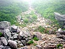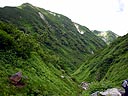 | 台風は進路NE、速度35Km。速度が上がった!迷走はない!それたたのだ。関東は天気が悪そう。一族軍団出発。今日は、双六まで行くそうな。我々にしては何時に無く早い出発。6時10分(いつも準備にてこずるのは俺だが)、既に小屋に残っている人は殆ど居ない状態。さすが、最奥地の山小屋。布団の上にいるのは我々と俺の横が寝床だった人<勝手に命名:聖人>だけである。皆、早出。先ず、水補給の為、テント場を目指す。 | ||