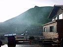 | かなり早いが宿泊の手続きを済まる。飛騨の匠の山小屋、木の香りがしそうな2段ベッドの2階に寝床を確保。 夕食1回目で4時半。早すぎ!でも、腹減った。ラーメン1杯を二人で食べる。それまで小屋の前でぶらぶら。今朝からタバコが切れている。(双六で小池さんが天気が良いのでお出かけになってしまい、タバコを恵んでもらえなかったのダ)。 |
